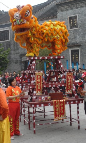 Two dancers are under an artistic lion dance costume and are accompanied by traditional Chinese instruments. The eyes and mouth of the lion can be moved and, together with the movements, represent the various states of mind of the lion.